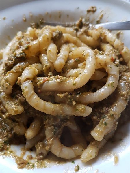 Pasta ideale da condire con questo pesto … le “busiate”, sorta di maccheroni lunghi attorcigliati a un ramo di buso o a un fil di ferro. Meritano l’assaggio inoltre il pesce fritto, le lumache cotte all’aglio e i dolci alle mandorle dalla raffinata delicatezza.