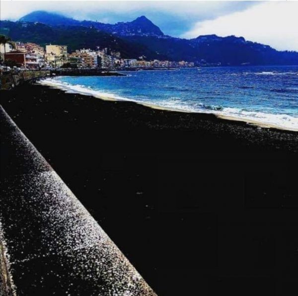 Il quindicesimo parossismo dell’Etna si è annunciato all’alba del 19 marzo con due fortissimi botti che hanno sorpreso le popolazioni pedemontane, da dietro le nuvole di pioggia e neve che nascondevano il vulcano. Come al solito, di lì a poco, sono iniziati i boati, le fontane di lava e la pioggia di cenere nera che stavolta ha interessato la fascia settentrionale – Piedimonte, San Giovanni Montebello, Giardini Naxos, Taormina. In particolare – come mostra la foto qui in basso, di MC Paravia – le spiagge di Naxos sono diventate nere creando uno spettacolo anomalo nel panorama.