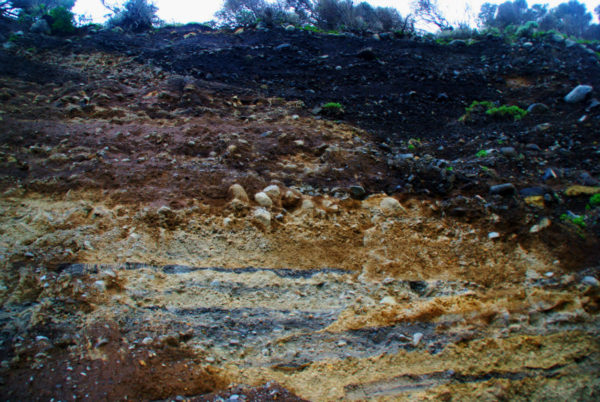 I vari strati di rocce e di terreno appaiono mescolati, intrecciati, frutto del rapido progredire della frana dopo il collasso dell’Etna, ma gli occhi esperti sanno riconoscere ancora bene i singoli elementi. Strati di fango alluvionale si confondono con i residui di materiale lavico molto antico, che testimonia la differenza tra il vulcano come era migliaia di anni fa e quello di ora.