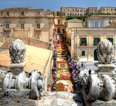Come detto, l’infiorata di Noto si svolge lungo la bellissima via Nicolaci dedicata alla famiglia il cui palazzo copre buona parte della strada. I balconi barocchi di Palazzo Nicolaci sono infatti il simbolo di Noto e la leggera pendenza della via permette a tutti di ammirare i disegni floreali da qualsiasi punto.