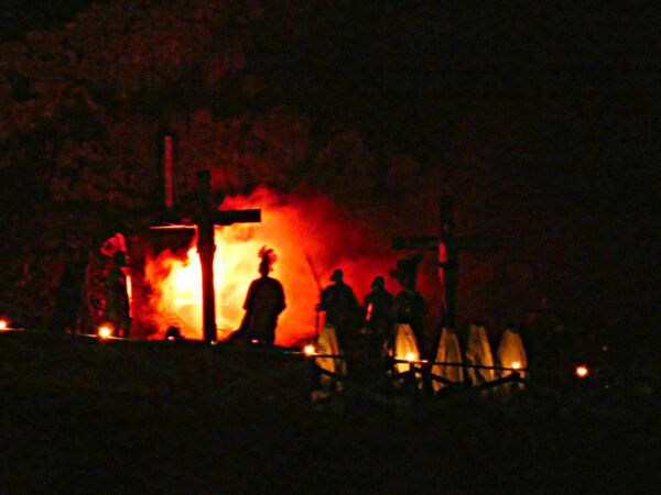 Durante la Domenica delle Palme, l’intero paese si cala nella parte dei figuranti della passione: soldati romani, sommi sacerdoti, pastori, donne di Gerusalemme… . Le scene chiave della Passione di Cristo hanno luogo in punti precisi del paese, e il pubblico di fedeli si sposta – insieme agli “attori” – lungo stradine, cortili e piazzette. Una volta giunti alla Chiesa Madre si svolge l’atto finale: la condanna, la fustigazione e il cammino verso il Calvario. Il pubblico non può andare oltre, solo ammirare dal basso Gesù e i soldati che salgono una lunga gradinata rocciosa fino alla cima della rocca… dove, tra suggestive musiche e passi del Vangelo recitati, avviene la crocifissione e resurrezione di Cristo (FOTO A LATO).
