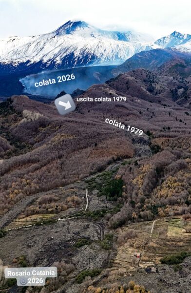 Come nota il fotografo Rosario Catania (autore dello scatto qui accanto), la colata lavica fuoriuscita dalla frattura “di Capodanno” sta seguendo quasi lo stesso percorso di una eruzione laterale precedente, quella del 1979. In quella occasione, la lava fortemente alimentata percorse una notevole distanza riuscendo a lambire l’abitato di Fornazzo e travolgendo boschi e campi nei dintorni.
