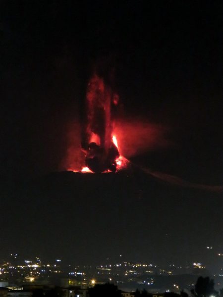 Verso le 18, al calare del sole, si sono cominciate a vedere le fontanelle di lava dal solito cratere di Sud Est. Verso le 19 era già diventata una unica grande fontana stromboliana. Ma il meglio doveva ancora venire. Tra le 22 e le 23, l’Etna ha “rotto gli argini”. Le fontane di lava si sono levate fino quasi a 1000 metri di altezza …. proiettando enormi massi infuocati a distanze considerevoli.